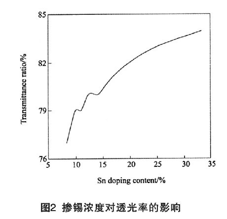 圖2為摻雜濃度對ITO薄膜透光率(λ=550nm)的影響關系曲線。ITO薄膜透光率隨著錫摻雜濃度增加,逐漸增大,ITO薄膜中錫離子含量的增加有利于提高ITO薄膜的透光率。