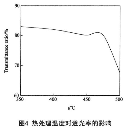 圖4為熱處理溫度對ITO薄膜透光率(λ=550nm)的影響關系曲線。熱處理溫度對透光率的影響在熱處理溫度為475℃之前并不大,當熱處理溫度高于475℃之后透光率隨熱處理溫度的增高迅速下降。