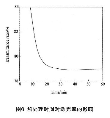 圖6為熱處理時間對ITO薄膜透光率(λ=550nm)的影響關系曲線。熱處理時間較短時ITO薄膜透光率較高,隨著熱處理時間的增加,ITO薄膜透光率隨之減小,當熱處理時間超過15min后,隨著熱處理時間的增加,ITO薄膜的透光率下降緩慢,熱處理時間超過30min后ITO薄膜的透光率基本不隨著熱處理時間的增加而變化。