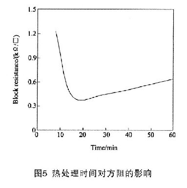 圖5為熱處理時間對ITO薄膜方阻的影響關系曲線。熱處理時間較短時ITO薄膜方阻較大,隨著熱處理時間的增加,ITO薄膜方阻迅速減小,當熱處理時間超過15min后,隨著熱處理時間的增加,ITO薄膜方阻緩慢上升。熱處理時間較短時,ITO薄膜晶粒較小,方阻較大;隨著熱處理時間的增加,ITO薄膜晶粒變大,方阻迅速下降;當熱處理時間超過15min后,隨著熱處理時間的增加,ITO薄膜晶粒尺寸變化不大,方阻變化不大。