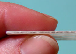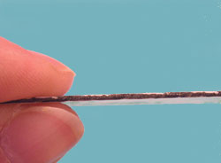 第一張圖片是PMC編織材料用40-PSI的空氣作為輔助氣體切割的情況,切邊處有輕微的碳化現(xiàn)象,這是典型的化學(xué)降解切割法造成的,激光能量將材料降解并被輔助氣體清除。由于這個(gè)應(yīng)用中切邊的質(zhì)量非常重要,因此我們將輔助氣體換成高壓氮?dú)?。在第二副圖片中我們可以看到,高壓氮?dú)?180 PSI)能顯著減少PMC材料切邊的碳化。
