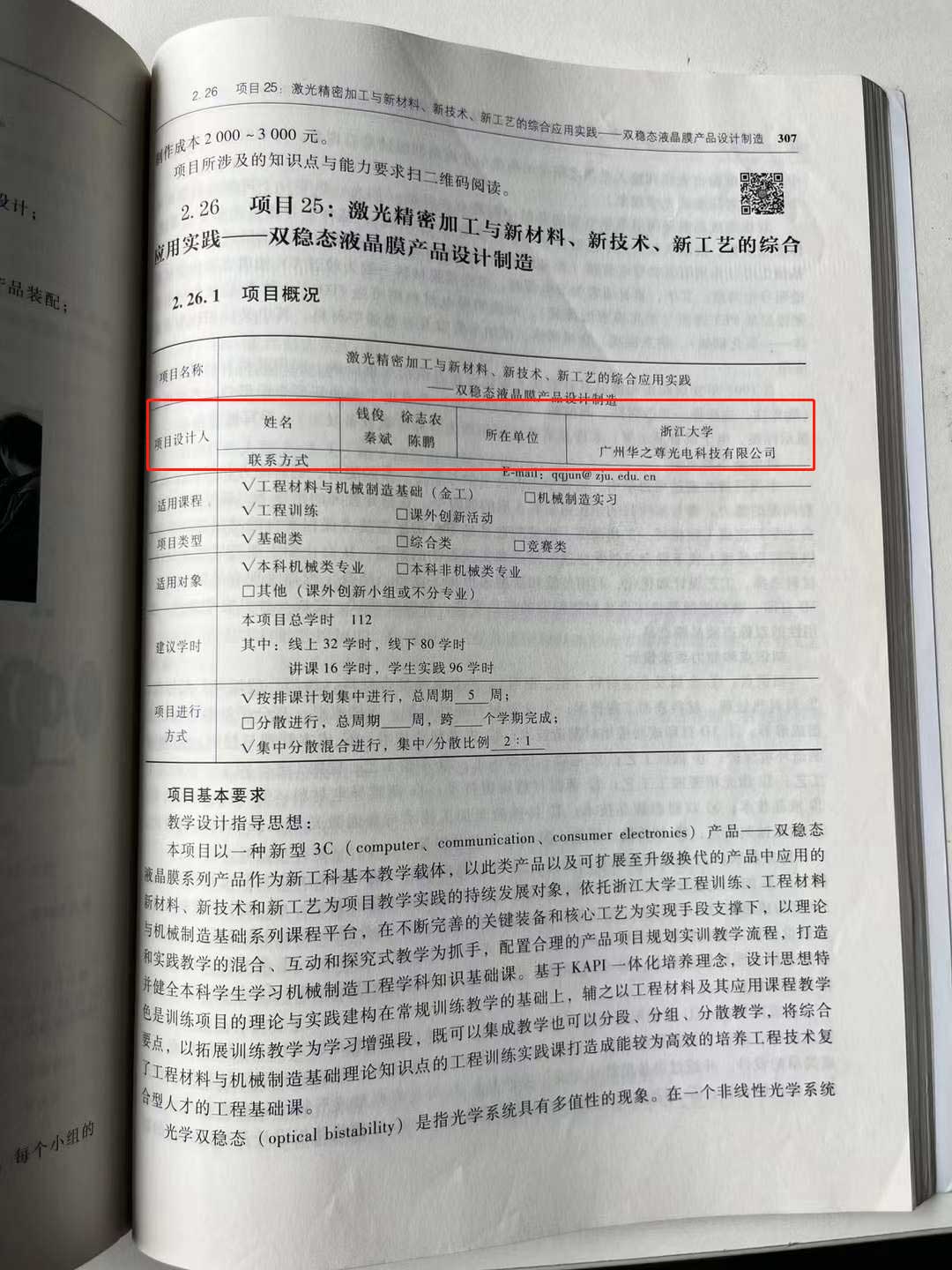 激光精密加工與新材料、新技術、新工藝的綜合應用實踐—雙穩(wěn)態(tài)液晶膜產(chǎn)品設計制造項目是由浙江大學和廣州華之尊光電科技有限公司基于新材料、新技術、新工藝共同推出的新型教材。項目以新型3C產(chǎn)品一雙穩(wěn)態(tài)液晶膜系列產(chǎn)品作為新工科基本教學教體,項目依托浙江大學工程訓練、工程材料與機械制造基礎系列課程平臺,在不斷完善的關鍵裝備和核心工藝為實現(xiàn)手段支撐下,以理論和實踐教學的混合、互動和探究式教學為抓手,配置合理的產(chǎn)品項目規(guī)劃實訓教學流程,打造并健全本科學生學習機械制造工程學科知識基礎課?;贙API一體化培養(yǎng)理念,設計思想特色是訓練項目的理論與實踐建構在常規(guī)訓練教學的基礎上,輔之以工程材料及其應用課程教學要點,以拓展訓練教學為學習增強段,既可以集成教學也可以分段、分組、分散教學,將綜合了工程材料與機械制造基礎理論知識點的工程訓練實踐課打造成能較為高效的培養(yǎng)工程技術復合型人才的工程基礎課。