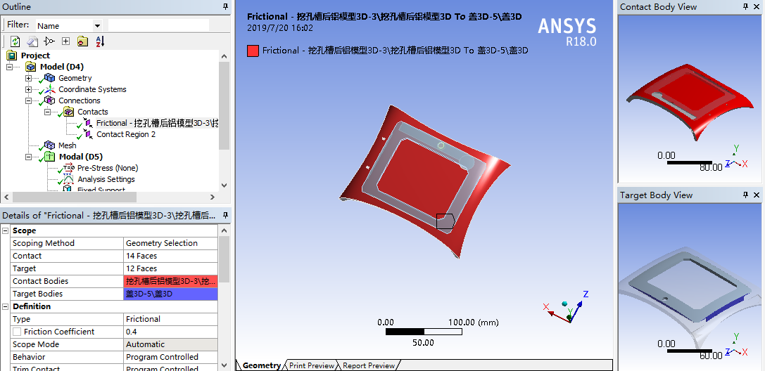將裝配體導(dǎo)入后,我們首先將蓋板和底座的接觸設(shè)為摩擦接觸,摩擦系數(shù)設(shè)為0.3.其它地方的接觸由于不是關(guān)鍵部位,所以就直接設(shè)為主體接觸,不設(shè)置摩擦.