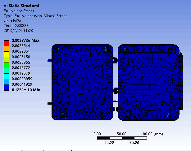 對(duì)于折疊式手寫(xiě)板所材料屬性也都大同小異,所加載荷為底板固定,上面給一個(gè)壓力載荷.從結(jié)果可見(jiàn)手寫(xiě)板完全承受在正常使用情況下所受的力.