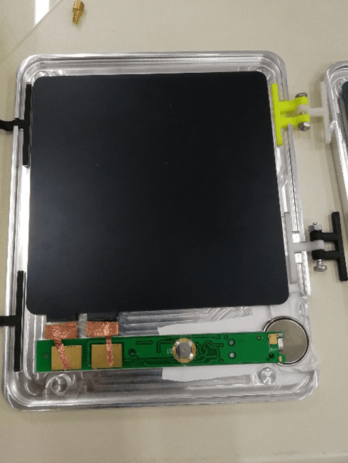 第二大困難是電路板的連接問(wèn)題.由于我們需要把電路板和電池舒適地放置在槽中,我們把電路板進(jìn)行了稍微的改造,用導(dǎo)電帶實(shí)現(xiàn)正負(fù)極連接,使電池得以平放.然而由于電路板與液晶膜極其敏感脆弱,研究如何連接才能使其正常工作花了我們較長(zhǎng)時(shí)間,甚至燒壞了不止一塊電路板.
