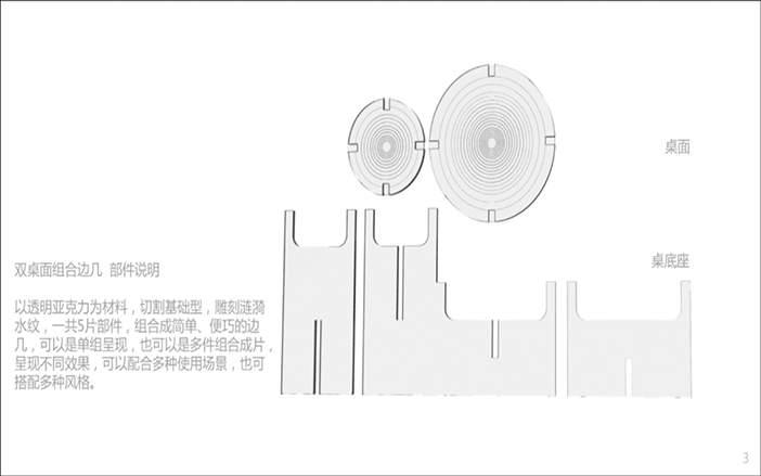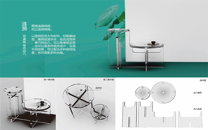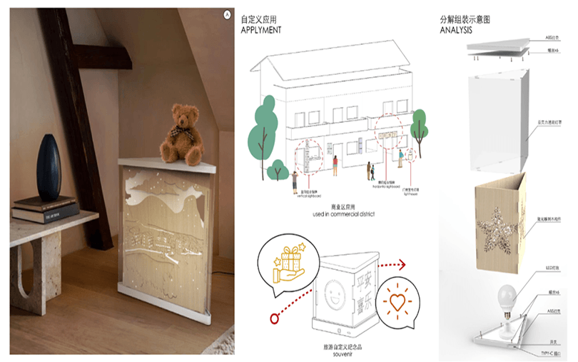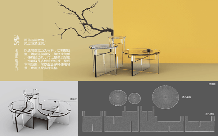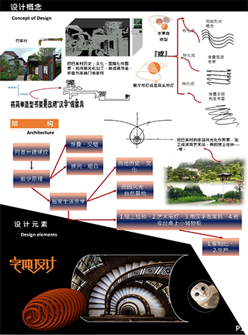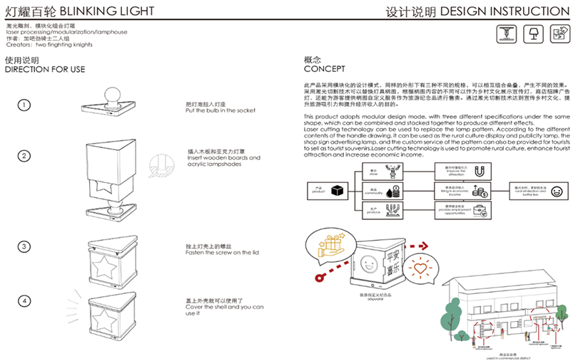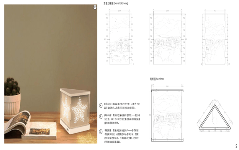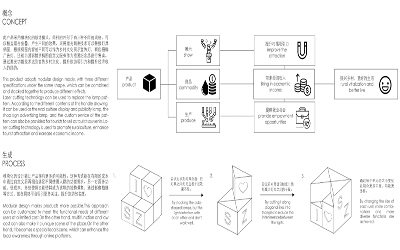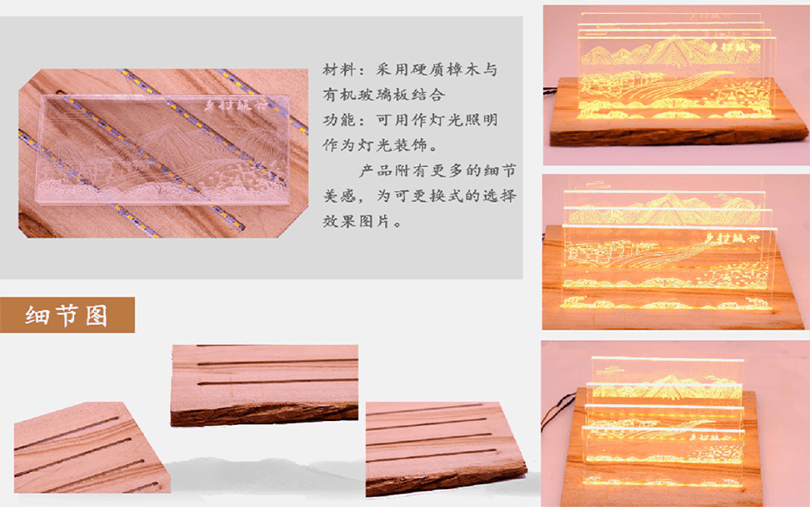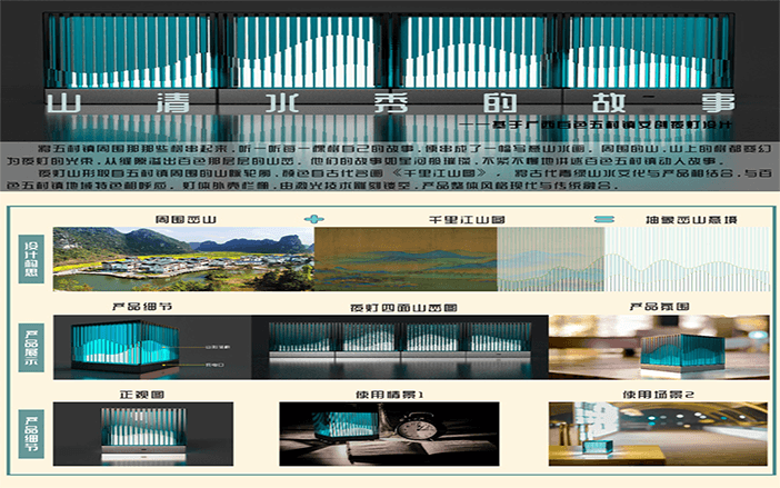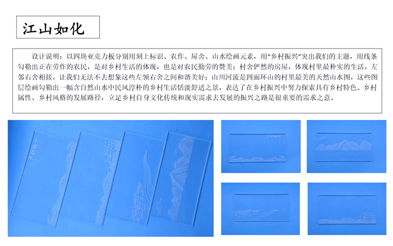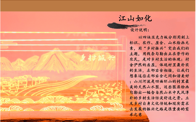 設(shè)計說明:四塊亞克力板上刻有標(biāo)牌、農(nóng)家、房屋和山水畫等元素。線條勾勒出農(nóng)民和別墅,反映出簡單的鄉(xiāng)村生活。鄰里相見,表現(xiàn)出和諧美好的人際關(guān)系。山脈、河流代表了寧靜舒適的鄉(xiāng)村生活。根據(jù)自身的文化傳統(tǒng)和農(nóng)村的實際需要,探索鄉(xiāng)村振興之路。