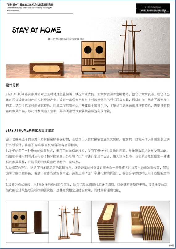 AT HOME系列家具針對巴某村地理位置偏僻、缺乏產(chǎn)業(yè)支持,但木材資源豐富的特點(diǎn),整合了木材資源,結(jié)合了當(dāng)?shù)氐拿袼拊O(shè)計(jì)與特色的鄉(xiāng)村旅游產(chǎn)業(yè),設(shè)計(jì)一套適合巴某村鄉(xiāng)村旅游特色的板式民宿家具。板材的加工結(jié)合了激光加工技術(shù)、巴某村的建筑特色和“巴某”二字的簡化,運(yùn)用并體現(xiàn)于家具當(dāng)中。以此增加民宿入住率,帶動周邊群眾發(fā)展民宿旅游實(shí)現(xiàn)增收。