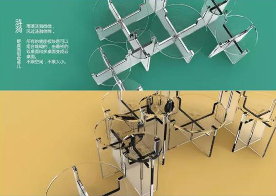 產(chǎn)品介紹:兩款組合方式,雙桌面和三桌面組合。除此以外可以將兩組邊幾的部件多數(shù)組合,形成高低錯(cuò)落的群組 合,就像落雨的湖面,漣漪朵朵。單組作為邊幾,適用于多種風(fēng)格空間,群組合視空間大小自由調(diào)整,亦適用于多種空間。以透明亞克力為材料,切割基型雕刻漣漪水紋,一共5片部件,組合成簡單、便巧的邊幾,可以是單組呈現(xiàn),也可以是多件組合成片,呈現(xiàn)不同效果,可以配合多種使用場景,也可搭配多種風(fēng)格