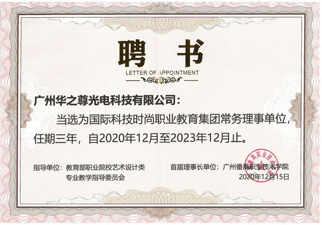 教育向善,共生未來!世界因你而溫暖!廣州華之尊光電科技有限公司榮獲國際科技時(shí)尚職業(yè)教育集團(tuán)常務(wù)理事單位。華之尊激光秦斌總經(jīng)理榮獲“雙高”建設(shè)項(xiàng)目——廣州番禺職業(yè)技術(shù)學(xué)院設(shè)計(jì)專業(yè)群建設(shè)指導(dǎo)委員會(huì)委員、國際科技時(shí)尚產(chǎn)教聯(lián)盟商務(wù)理事。