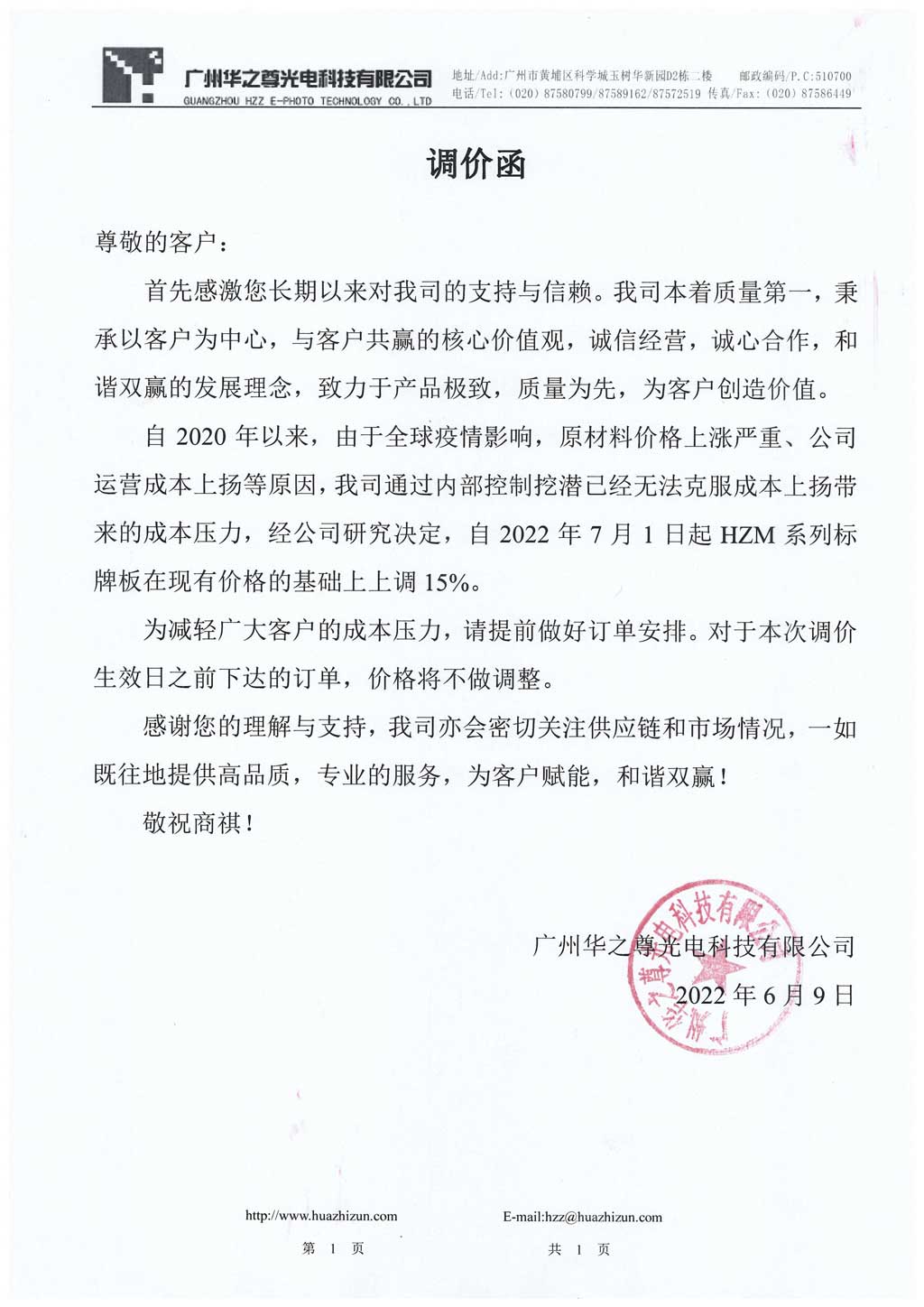 自2020年以來(lái),由于全球疫情影響,原材料價(jià)格上漲嚴(yán)重、公司運(yùn)營(yíng)成本上揚(yáng)等原因,我司通過(guò)內(nèi)部控制挖潛已經(jīng)無(wú)法克服成本上揚(yáng)帶來(lái)的成本壓力,經(jīng)公司研究決定,自2022年7月1日起HZM系列標(biāo)牌板在現(xiàn)有價(jià)格的基礎(chǔ)上上調(diào)15%。