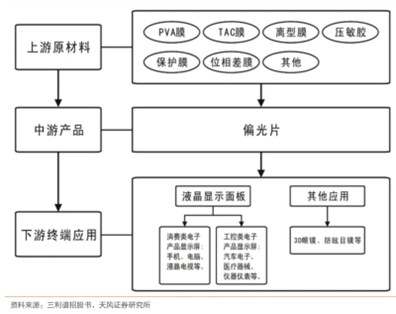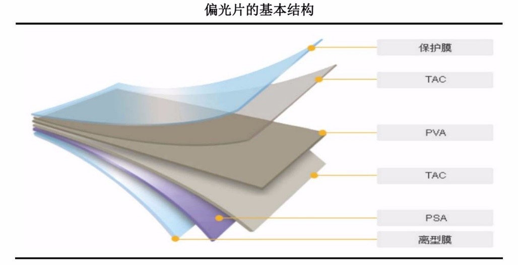 偏光片的全稱是偏振光片,是一種具有特殊光學特性的材料,能夠選擇性地吸收、透射或反射特定方向的光線,從而實現(xiàn)光的偏振作用。主要由TAC膜、PVA膜、保護膜、增量膜、壓敏膠、相位差膜等復合而成,具有高度透明性和柔韌性。基本結構是兩層TAC膜,夾一層拉伸后的PVA膜。通過調整不同的膜材料構成可以滿足偏光片的高耐性、不同厚度等要求。