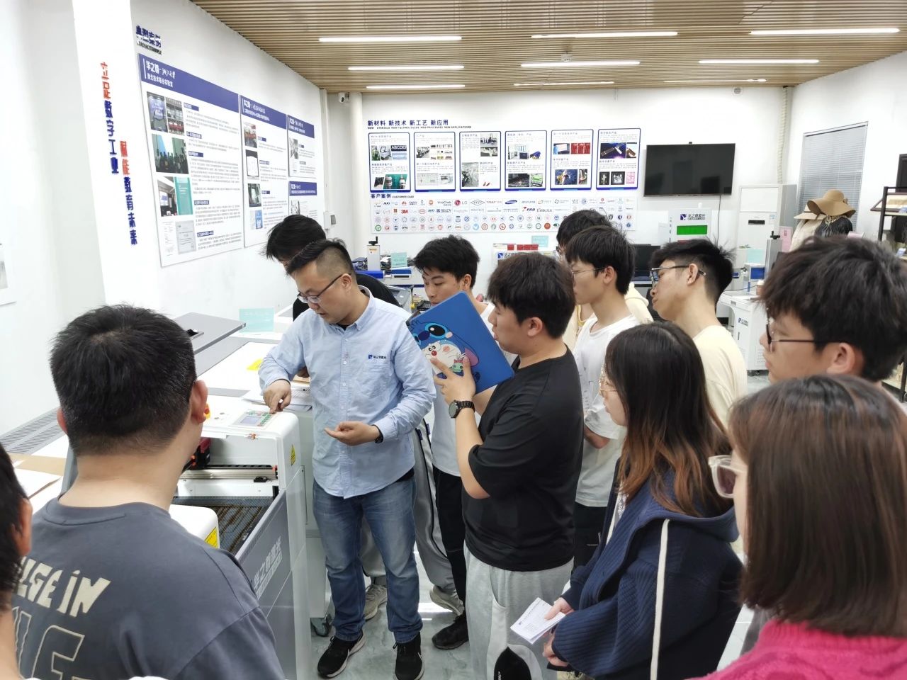 為了讓學(xué)生們更好地了解激光行業(yè)的發(fā)展趨勢(shì),華之尊激光總經(jīng)理·秦斌帶領(lǐng)學(xué)生參觀公司的激光技術(shù)應(yīng)用研究區(qū)、設(shè)備區(qū)、應(yīng)用作品展示區(qū)、新材料·新技術(shù)·新工藝·新應(yīng)用探究區(qū),并為他們做了詳細(xì)解說(shuō),使學(xué)生了解了激光技術(shù)的最新應(yīng)用和行業(yè)動(dòng)態(tài)。為后續(xù)的設(shè)備培訓(xùn)打下堅(jiān)實(shí)的基礎(chǔ)。
