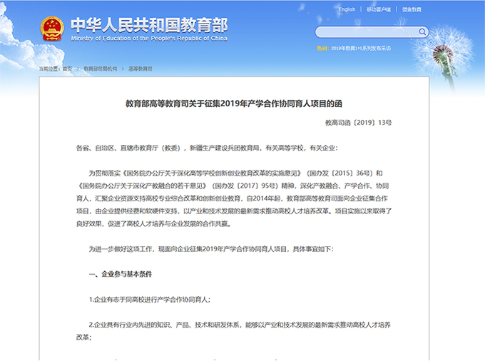 教育部高等教育司關(guān)于公布有關(guān)企業(yè)支持的產(chǎn)學(xué)合作協(xié)同育人項(xiàng)目申報(bào)指南(2019年第一批)的通知